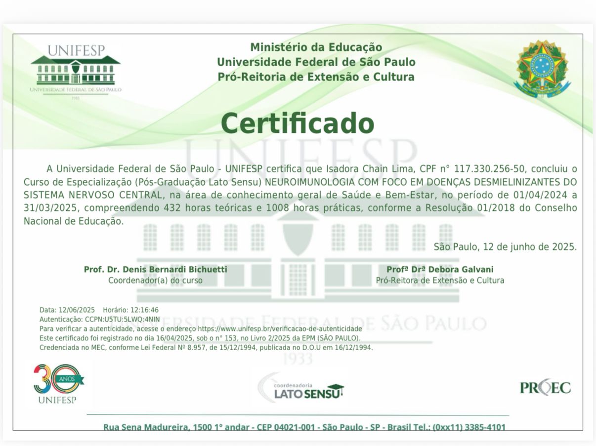 Sou médica neurologista com residência concluída pela Universidade Federal de Juiz de Fora. Além de me especializar em todas as condições referentes à neurologia geral, após a conclusão da residência passei mais um ano me especializando na área de Neuroimunologia, área em que estudamos as patologias autoimunes que comprometem o sistema nervoso central, sendo as mais conhecidas a Esclerose Múltipla e a Neuromielite Óptica. Tenho como grande objetivo na medicina ter um papel de ferramenta transformadora na qualidade de vida dos pacientes que atendo, objetivando sempre o cuidado humanizado, cuidadoso, carinhoso e eficaz.